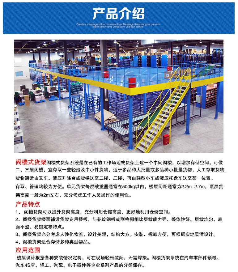 阁楼式货架系统是在已有的工作场地或货架上建一个中间阁楼,以增加存储空间,可做二、三层阁楼,宜存取一些轻泡及中小件货物,适于多品种大批量或多品种小批量货物,人工存取货物.货物通常由叉车、液压升降台或货梯送至二楼、三楼,再由轻型小车或液压托盘车送至某一位置。 近几年多使用冷轧型钢楼板,它具有承载能力强、整体性好、承载均匀性好、精度高、表面平整、易锁定等优势.有多种类型可选,并且易匹配照明系统,存取、管理均较为方便。单元货架每层载重量通常在500kg以内,楼层间距通常为2.2m~2.7m,顶层货架高度一般为2m左右,充分考虑工作人员操作的便利性。 楼层设计根据各种安装情况定制,可在现场轻松装配,无需焊接。阁楼货架系统在汽车零部件领域、汽车4S店、轻工、电子等行业有较多应用。